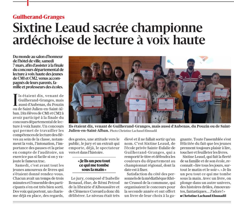 L'école Sainte-Eulalie de GUILHERAND-GRANGES est une école catholique sous la tutelle de Diocèse. En tant qu'institution d'église, elle n'existe que par la volonté des parents. Elle est sous contrat d'association avec l'Etat. C'est une école primaire ouverte à tous. Elle reçoit les enfants dès l'âge de 2 ans le matin (année civile) et compte 7 classes de la maternelle à l'élémentaire.